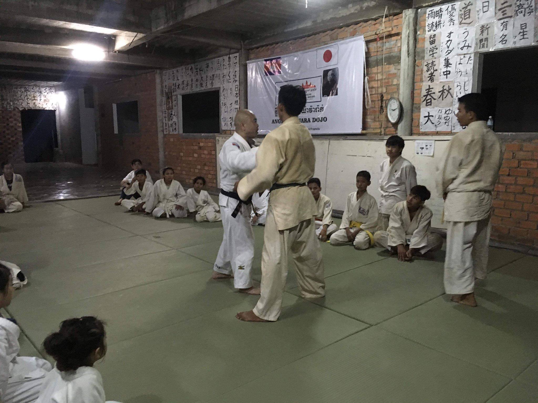 アンコール遺跡があるシエムレアプ州にある国際日本文化学園(IJCI)の中に道場があり、近くにホテルを予約すればトゥクトゥクで片道約2米ドルで行くことができます。若い男性カンボジア人指導員が中心となって、土曜日と日曜日の17時半~20時に稽古をしています。稽古の内容は、音楽がかかる中、ウォーミングアップを約1時間しっかり行い、その後、打ち込み、技の指導等を中心に行っています。