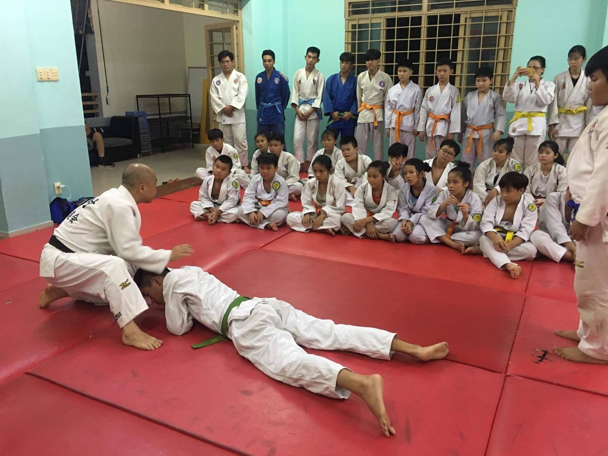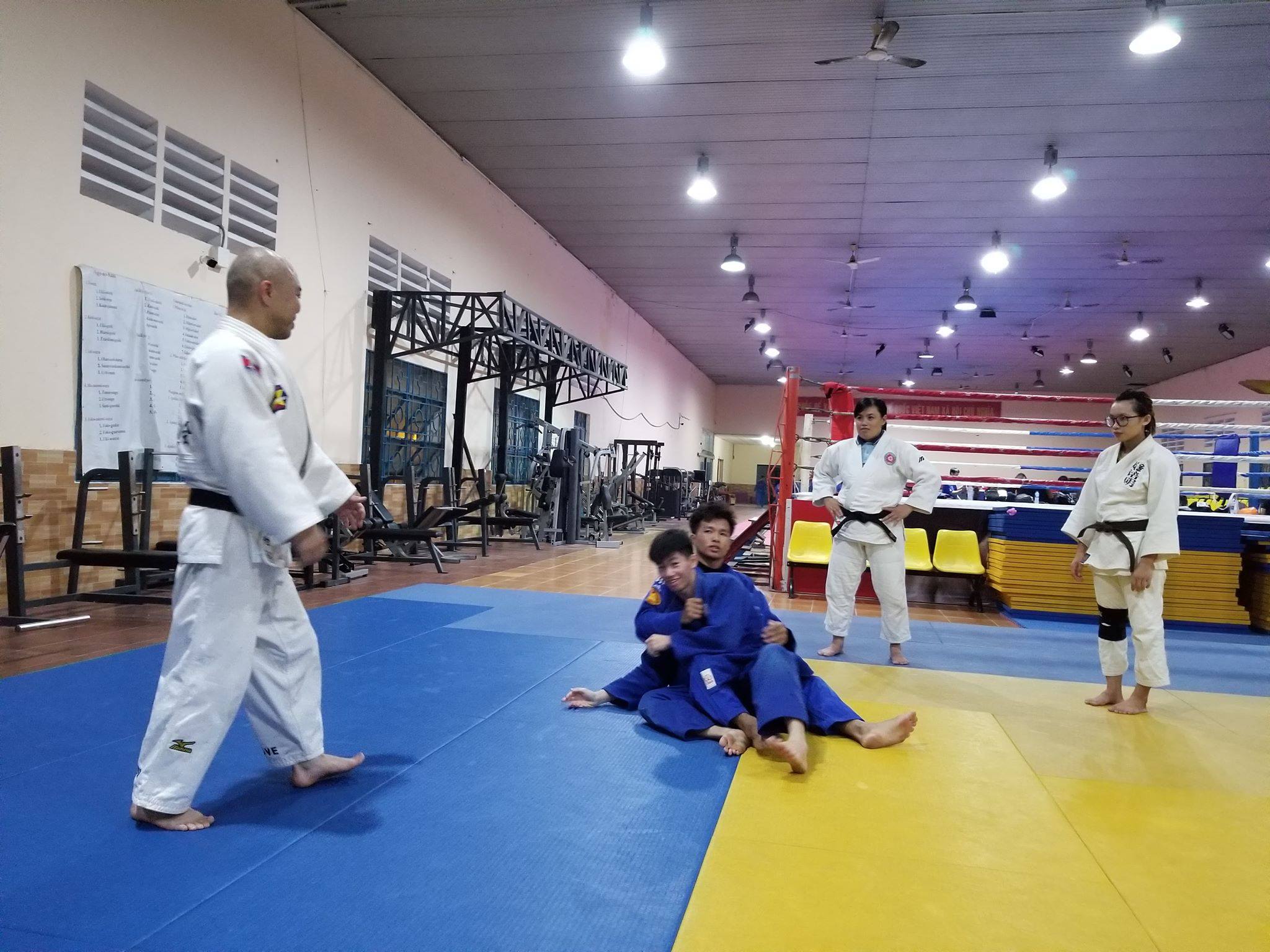 ホーチミン市の隣にあるスポーツ施設内にあり、元ベトナム代表のNguyen Duy先生、Tran Son Thai先生が中心となって毎日18時半~21時まで指導している道場です。小学生から大人まで150名以上が在籍し、ホーチミン市内の大会等で優勝或いは準優勝等の好成績を収めています。稽古の内容は、ウォーミングアップ後、打ち込み、寝技、乱取り等を中心に行っています。今回は、背負い投げと寝技のポイントを披露後、個別指導をさせて頂きました。小学低学年くらいの子どもが多く、小さな力で大きな相手を担いだり、動かす様子に拍手喝采でした。あいにく、ヒウ先生は不在でしたが、同僚のLoi Tien Duc先生が日本語からベトナム語に通訳して頂きました。なお、①~⑦の情報は、英語等でのやりとりであり、もしかしたら正確ではないものもあるかもしれません。ご了承下さい。