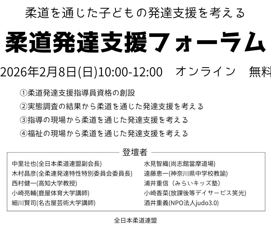 【全柔連主催「柔道を通じた発達支援を考える」2/8(日)10:00-12:00オンライン(無料)で開催!】